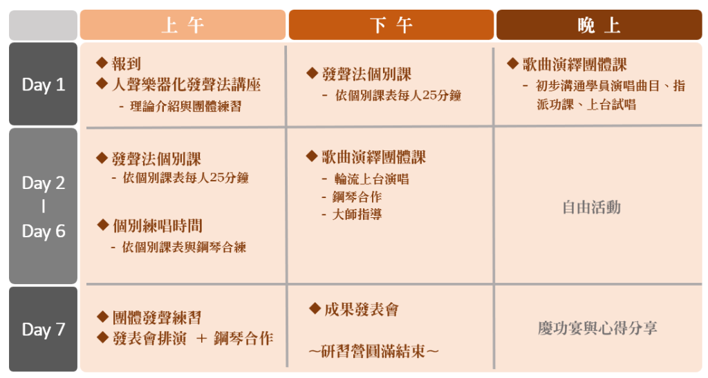• 成果發表:課程最後一日,於小型音樂廳安排成果發表演唱會 (音樂會型式可由學員事先討論)。